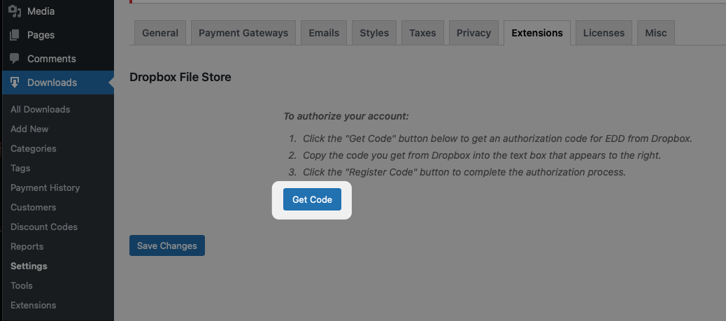 EDD Dropbox File Store extension allows you to store download files in your Dropbox account. Once installed and activated, you will need to authorize the EDD Dropbox File Store app to access your Dropbox account on the Downloads → Settings → Extensions page in your WordPress dashboard. To start, click the Get Code button.