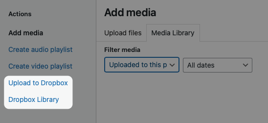 To upload a file through WordPress, click on the Upload to Dropbox option on the Upload Media pop-up in WordPress. This will display the folder structure of your Dropbox folder along with a button to select the file you want to upload.