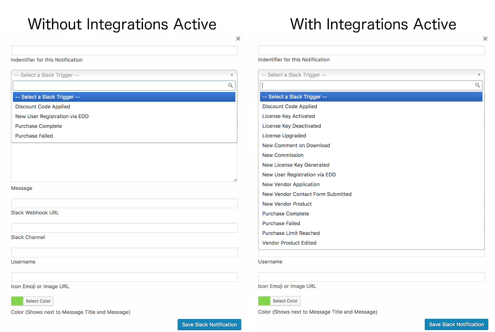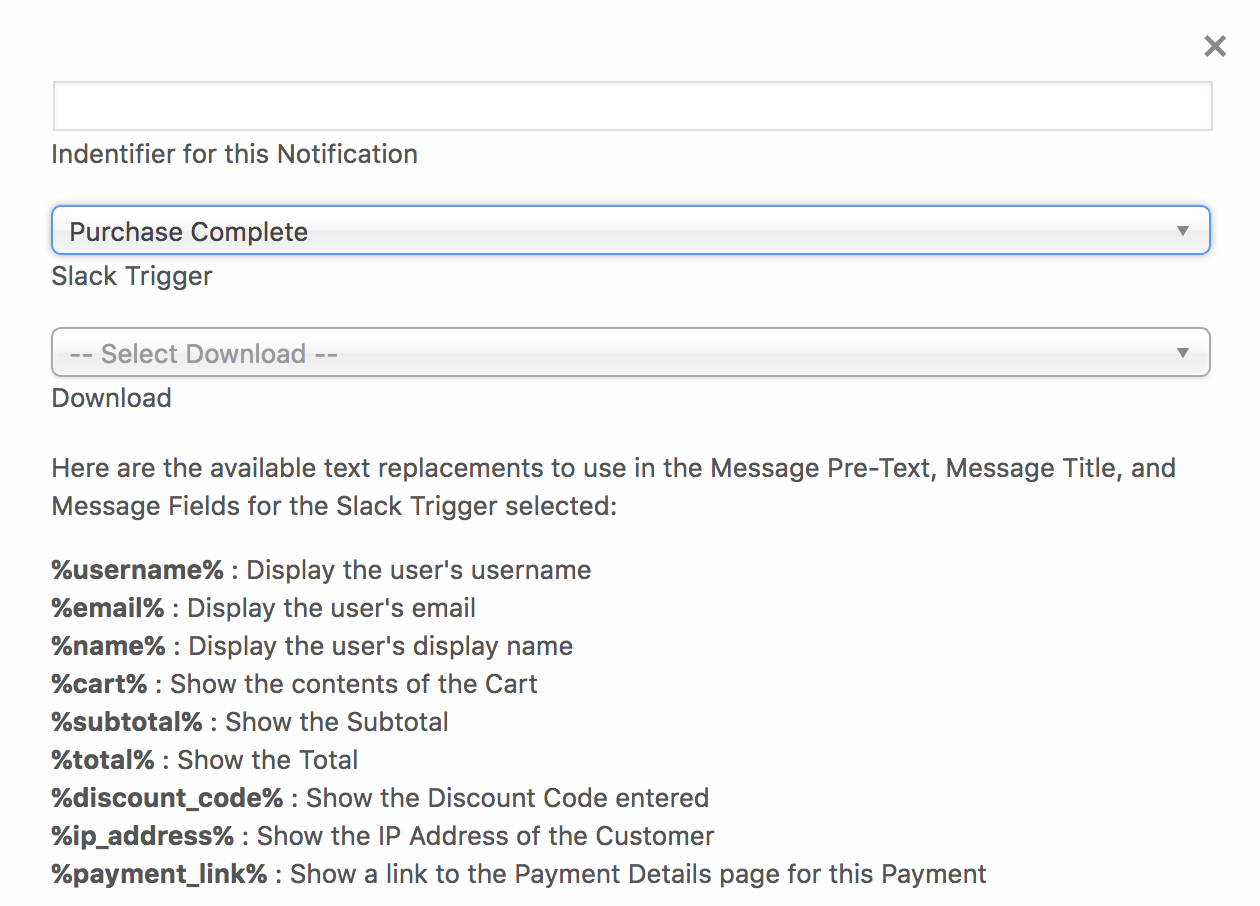 Slack Trigger: Defines the Trigger which results in this notification sending a message to Slack. This can be an action within Easy Digital Downloads or another supported Easy Digital Downloads Extension. Based on the choice of Trigger, additional fields will be added to the Form and different Text Replacements for the Message Pre-text, Message Title, and Message fields will become available so that pertinent information about the Notification can be passed to Slack.