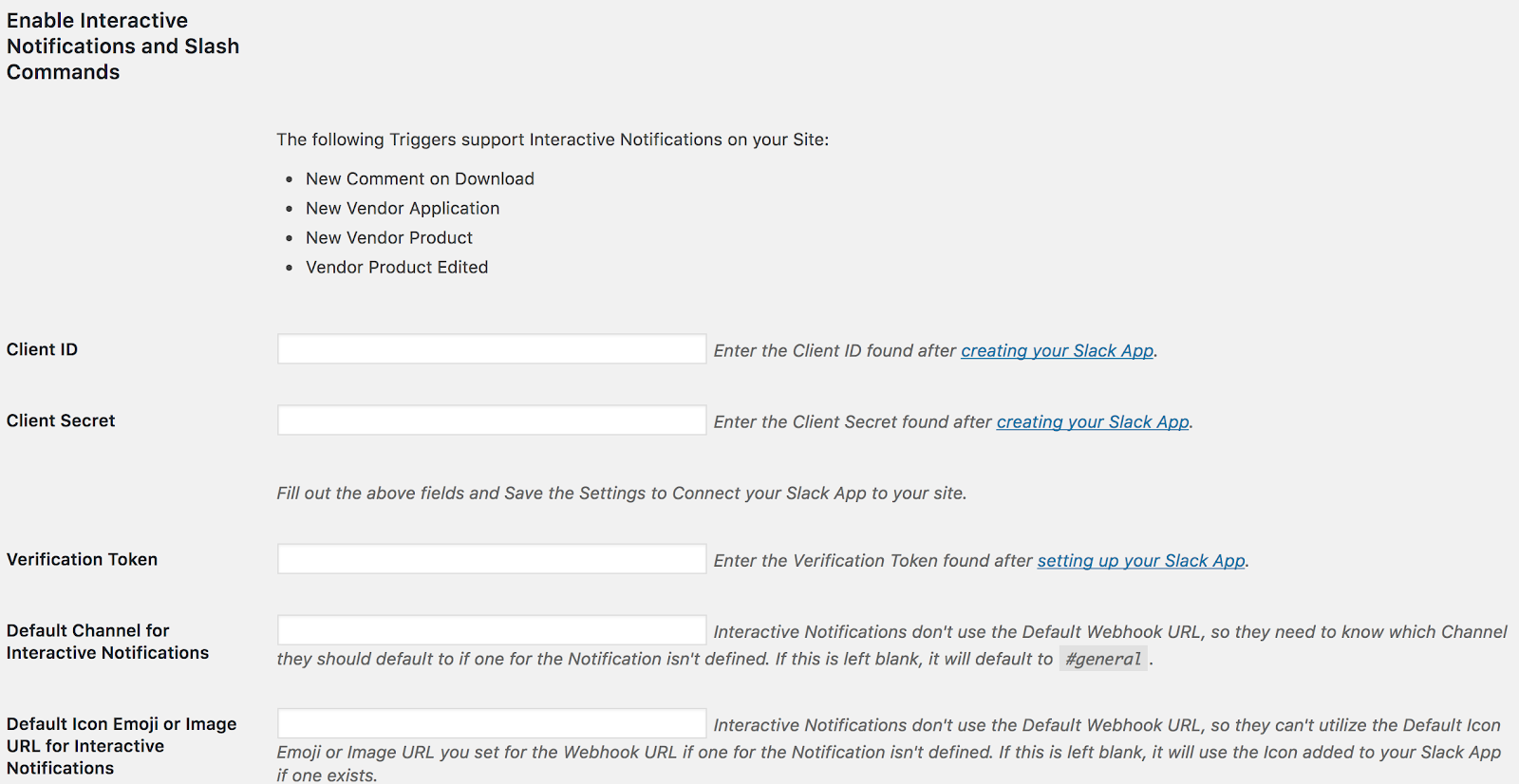 These steps are optional, but unlock extra functionality within EDD Slack. If you follow these steps, you will be able to perform actions on your site directly from a Slack Notification by clicking a Button within a Slack notification as well as return data from your site using Slash Commands.