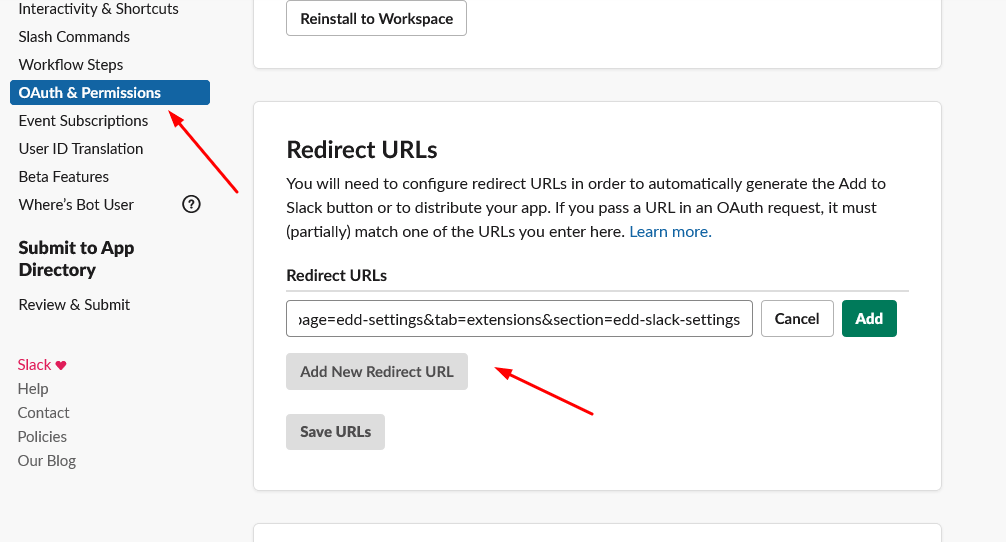Before you can click the “Link Slack App” button that appears, you will need to define a Redirect URL for the Slack App. Back in the settings for the Slack App you created: