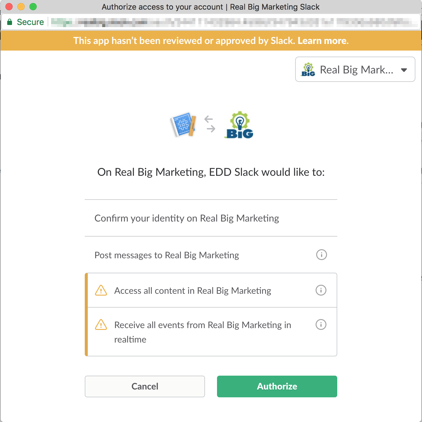 Once you click this button, a similar popup window will appear as when you previously set up Interactive Messages and Slash Commands. This is because you need to grant more permissions to your Slack App.