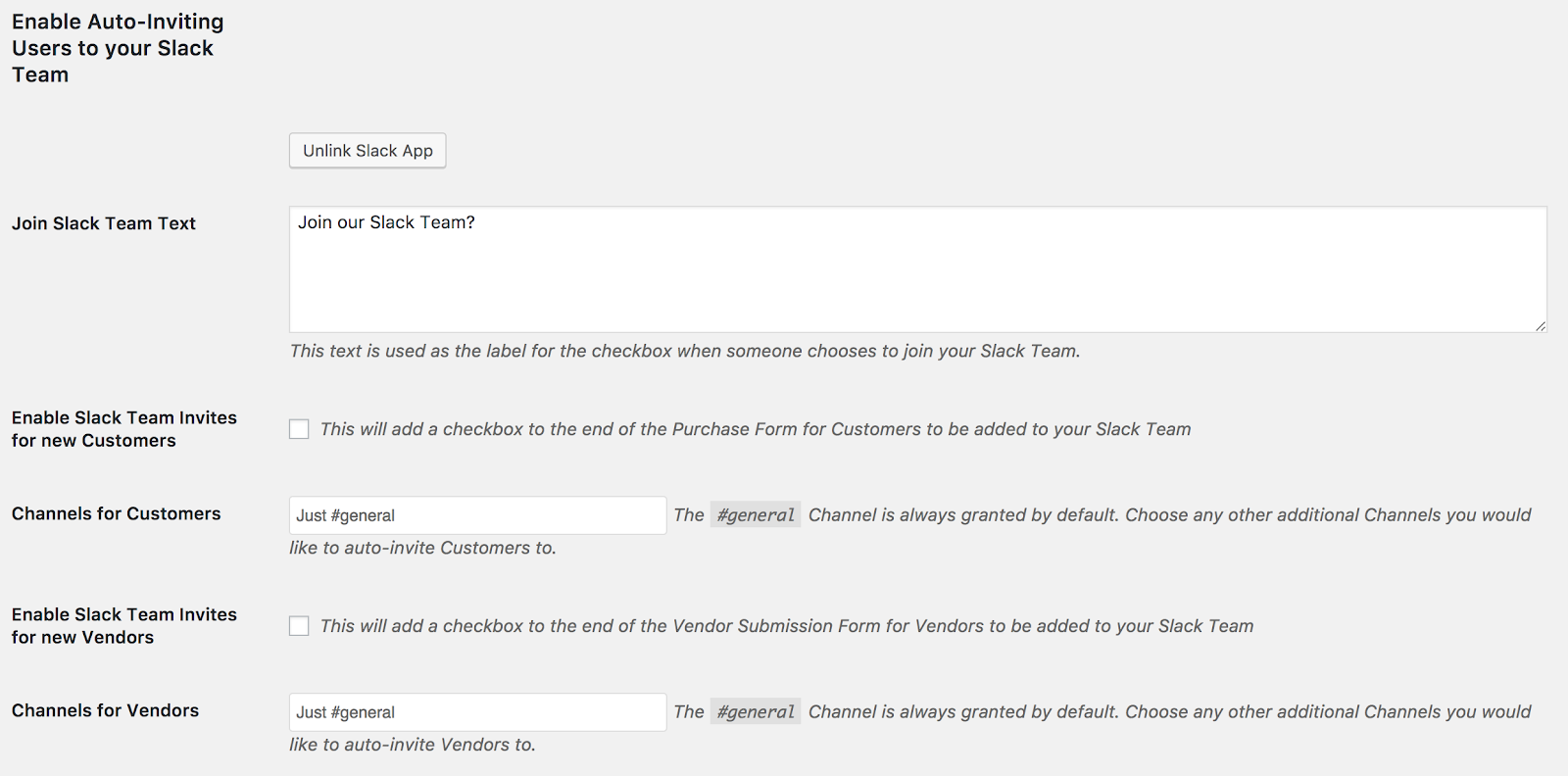 Once this is done some new options appear. This allows you to enable Slack Team Invites for Customers as well as Slack Team Invites for Vendors (If the Frontend Submissions extension is active on your site).