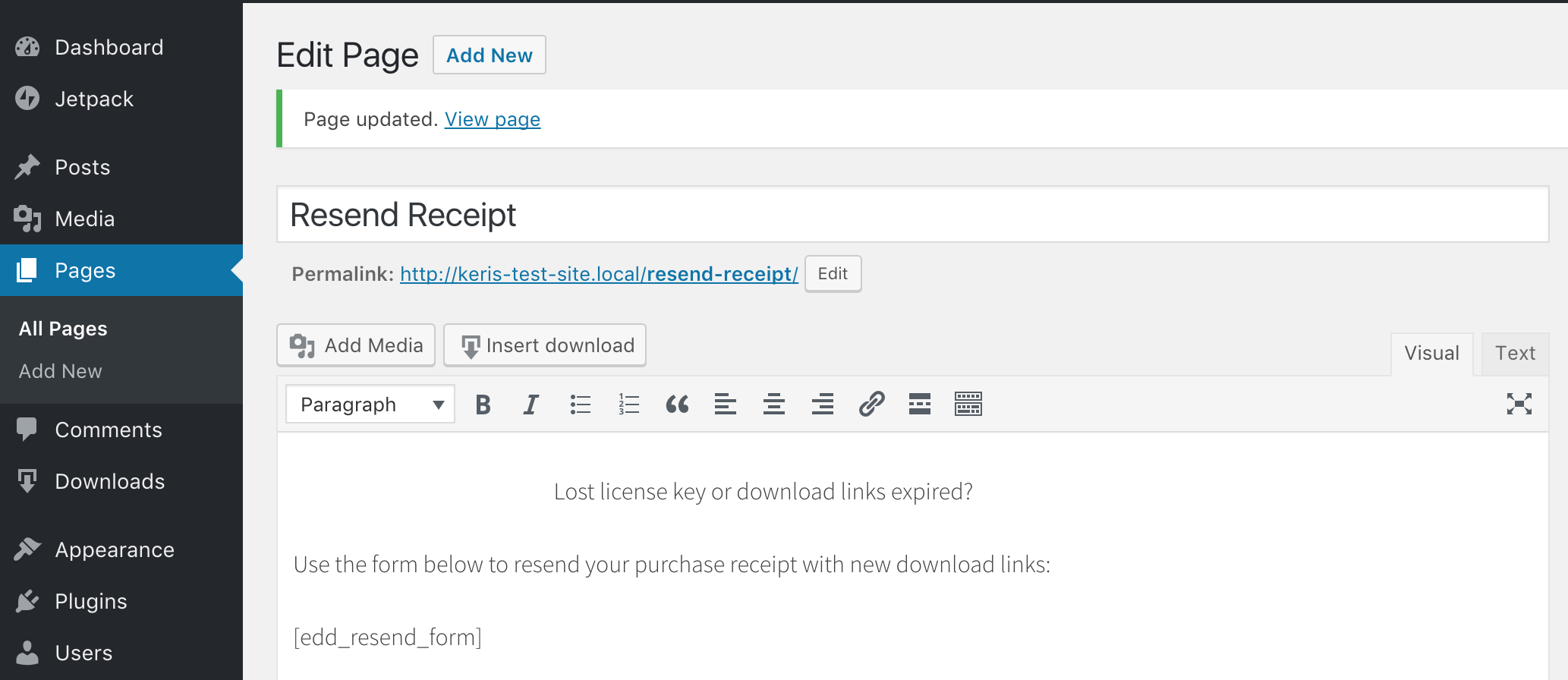 After installing the Resend Receipt plugin, create a new page and add the shortcode: