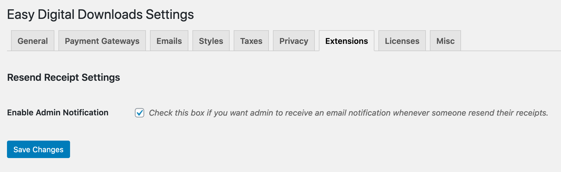 Resend Receipt settings can be found by navigating to Downloads → Settings → Extensions. There is an option to Enable Admin Notification. Check this box to receive a notification when a user resends their receipt.