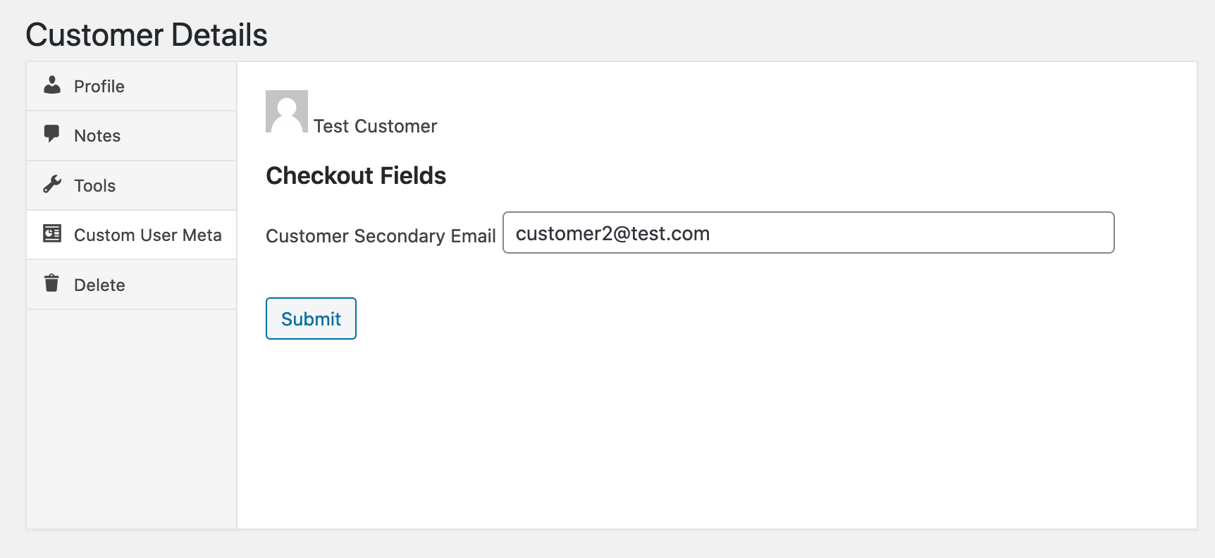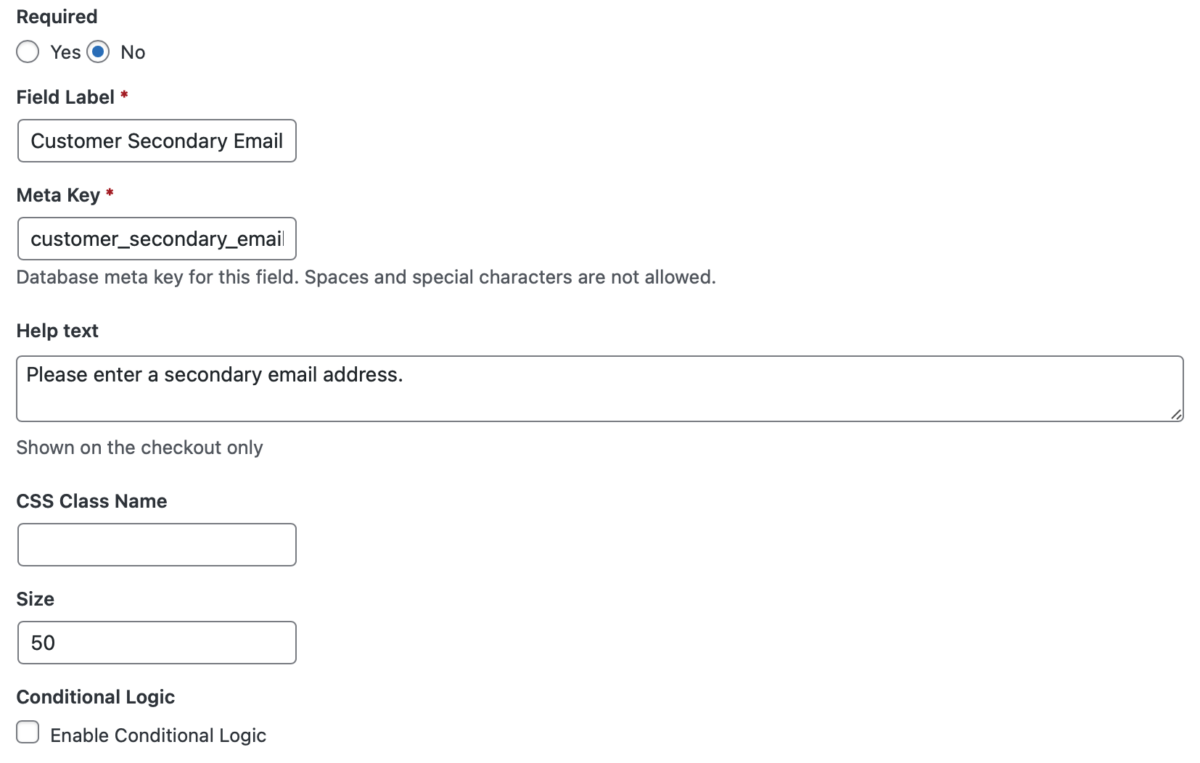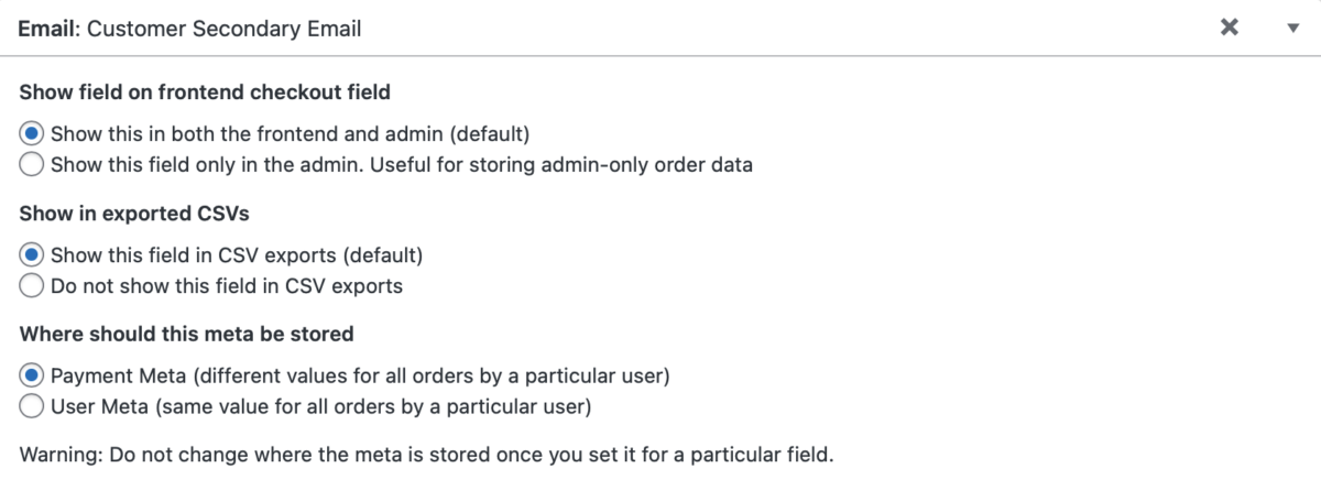 For the examples shown below, we’re adding an email text field called Customer Secondary Email. This first image is an example of the setup for all of the User Meta output examples below.