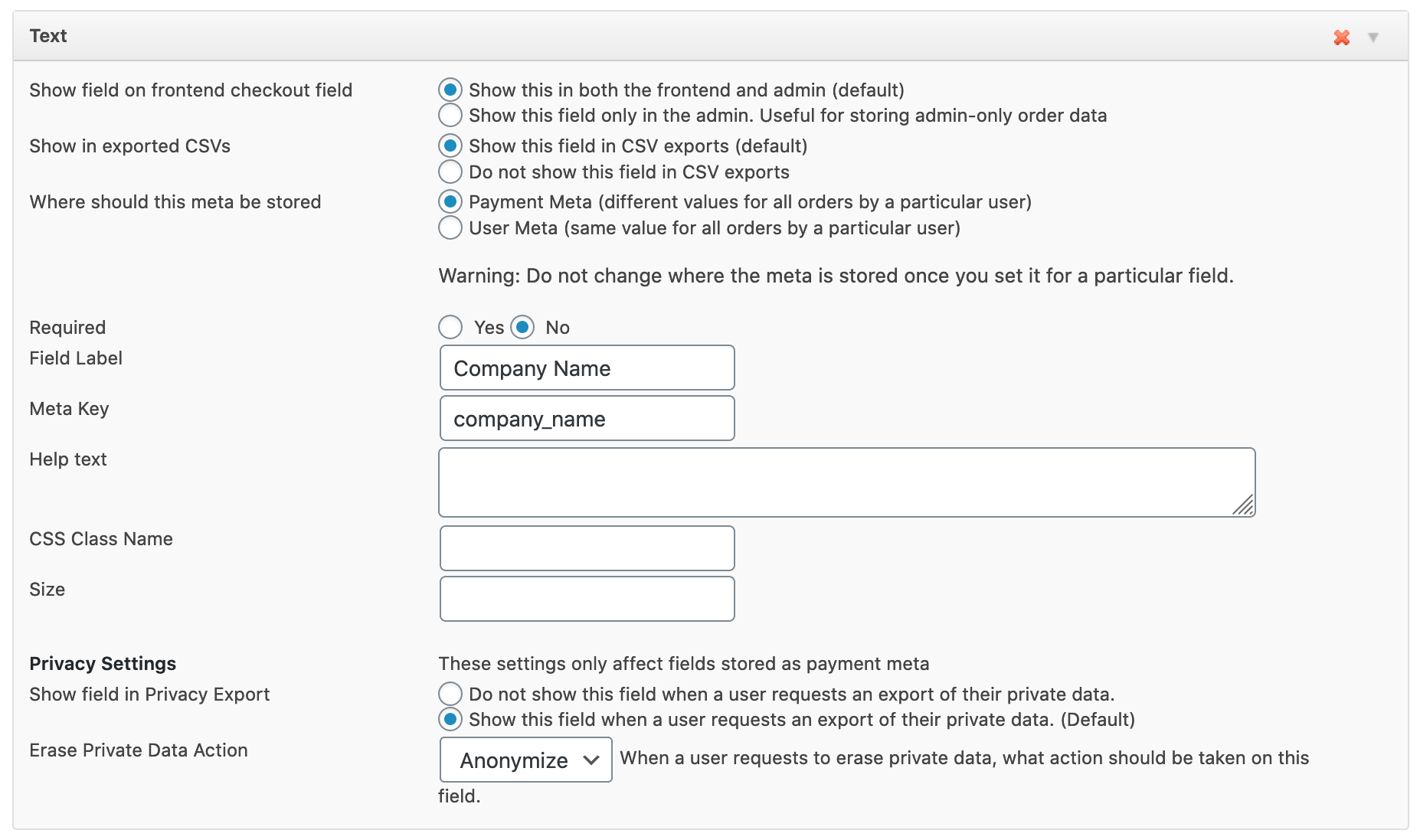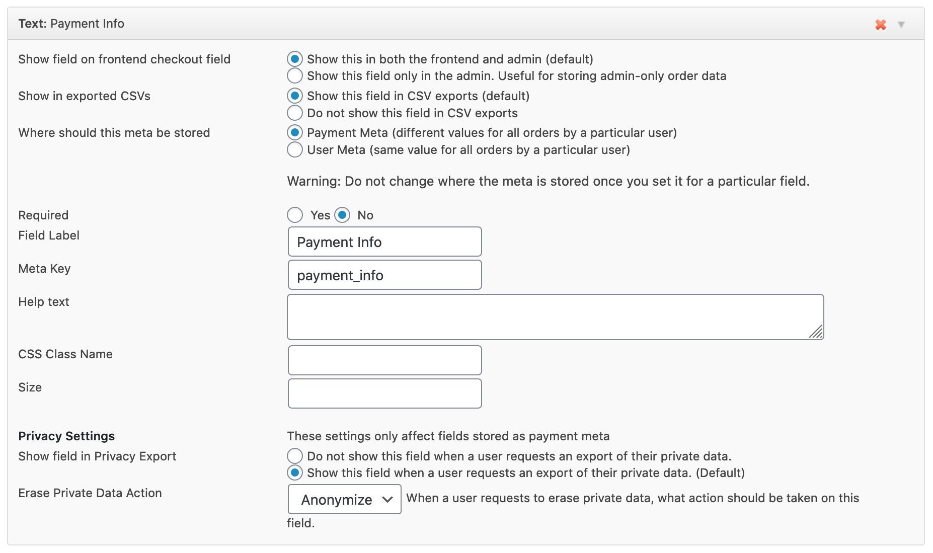 When creating a new field you’ll usually be asked if you want to store the data in User Meta or Payment Meta. Here’s a brief description of each.