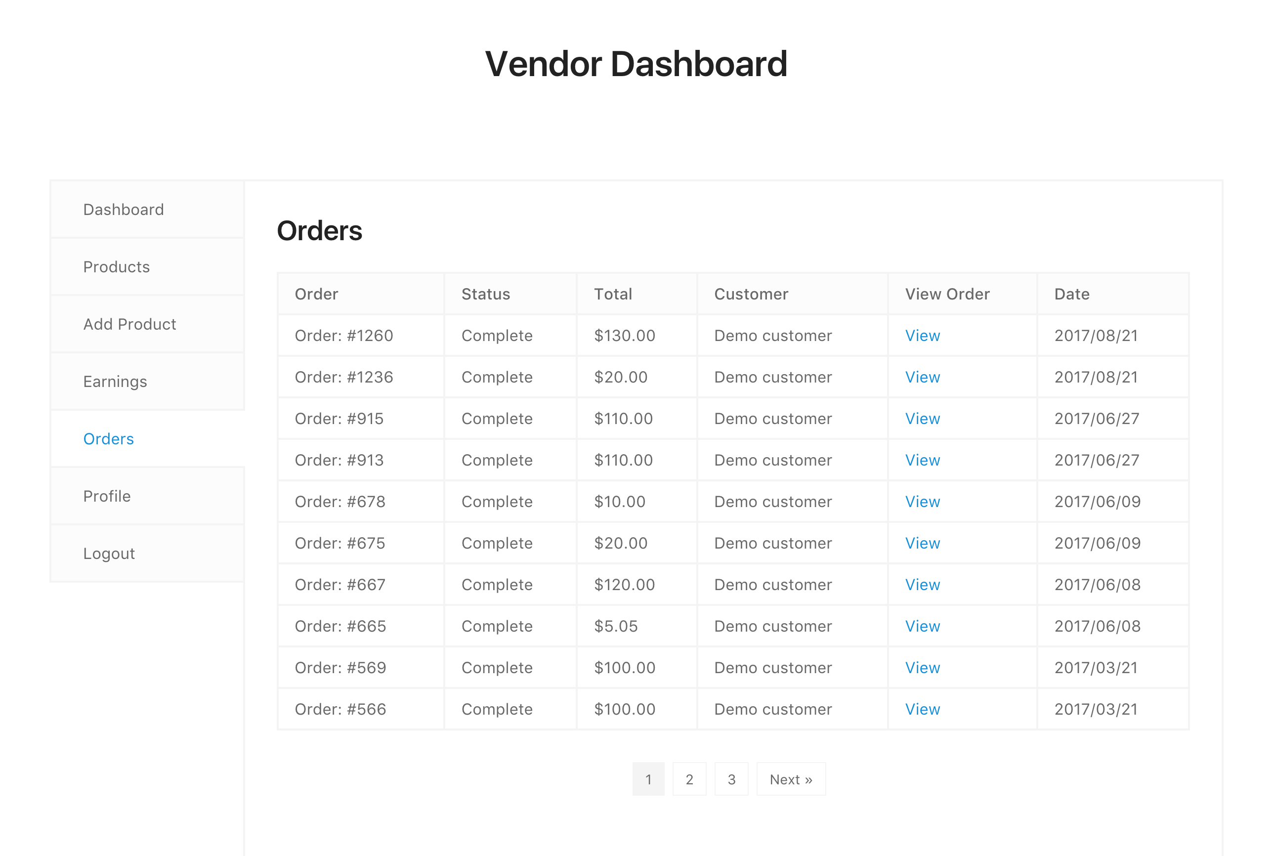 The vendor dashboard's "Orders" tab in Frontend Submissions