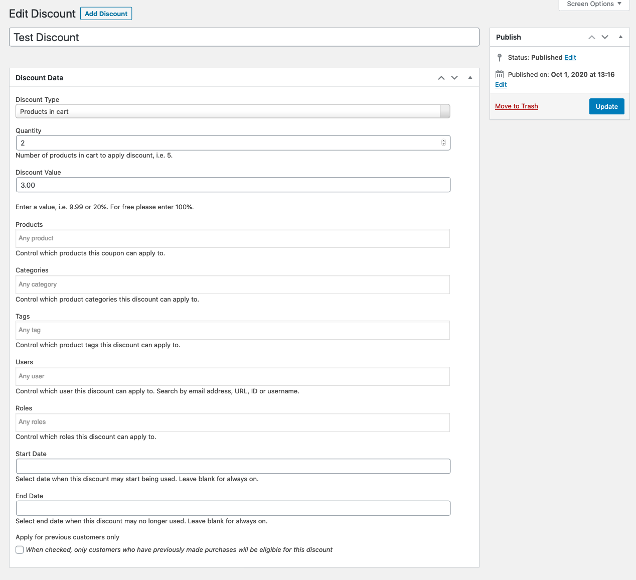 NOTE: If product quantity and individual products are set and the amount of products selected matches the quantity set, then the discount will only apply when those specific products are in the cart. Example: If product quantity is “2” then you can only choose 2 products for the discount to apply to.