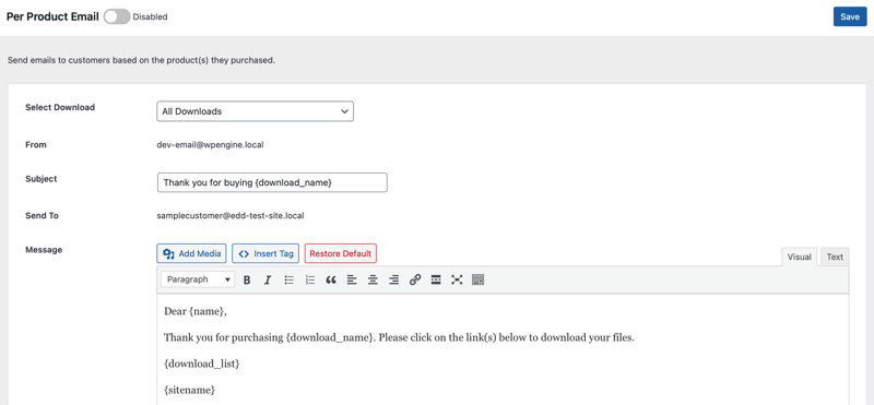 This will open the email editor to create your Per Product email, for the selected Download.