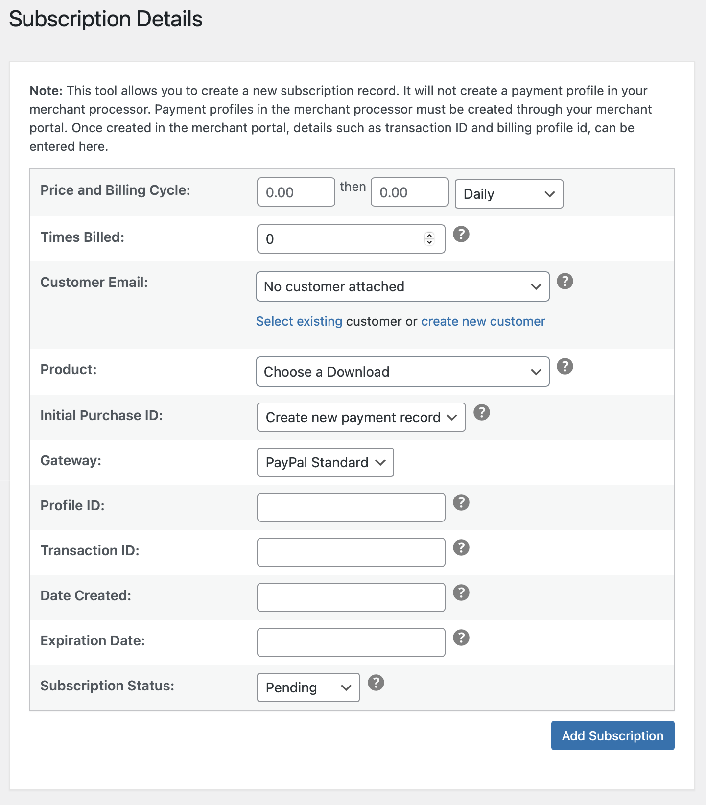 This document covers manually creating subscriptions and migrating subscriptions from another platform. It will not create a payment or subscription record at the payment gateway, this is for the purpose of adding a subscription to EDD that already exists at the payment gateway or for testing purposes.