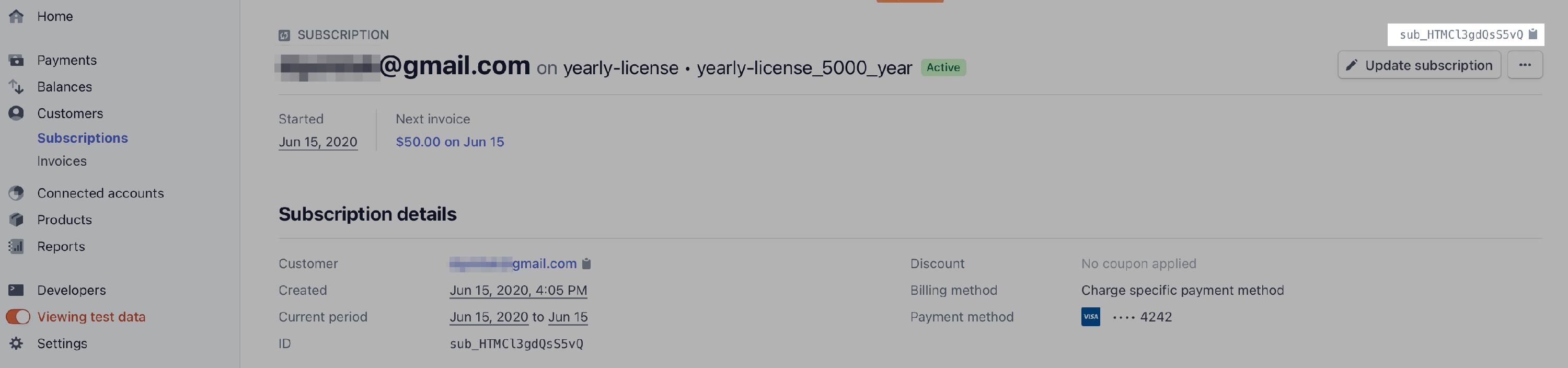 6. Open the new subscription in Stripe and copy the Subscription ID. Use that when creating or re-creating the subscription in EDD using the instructions in this documentation.