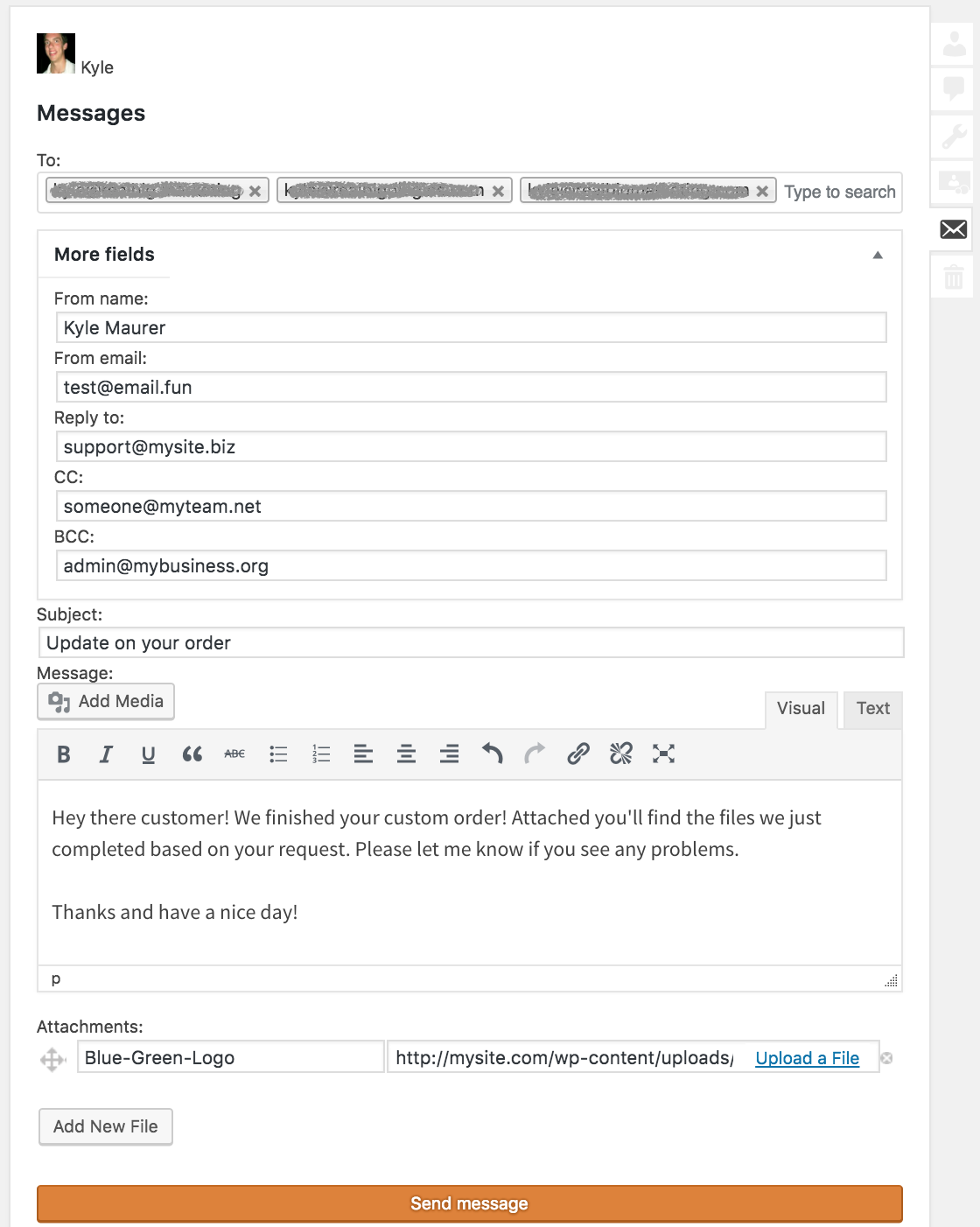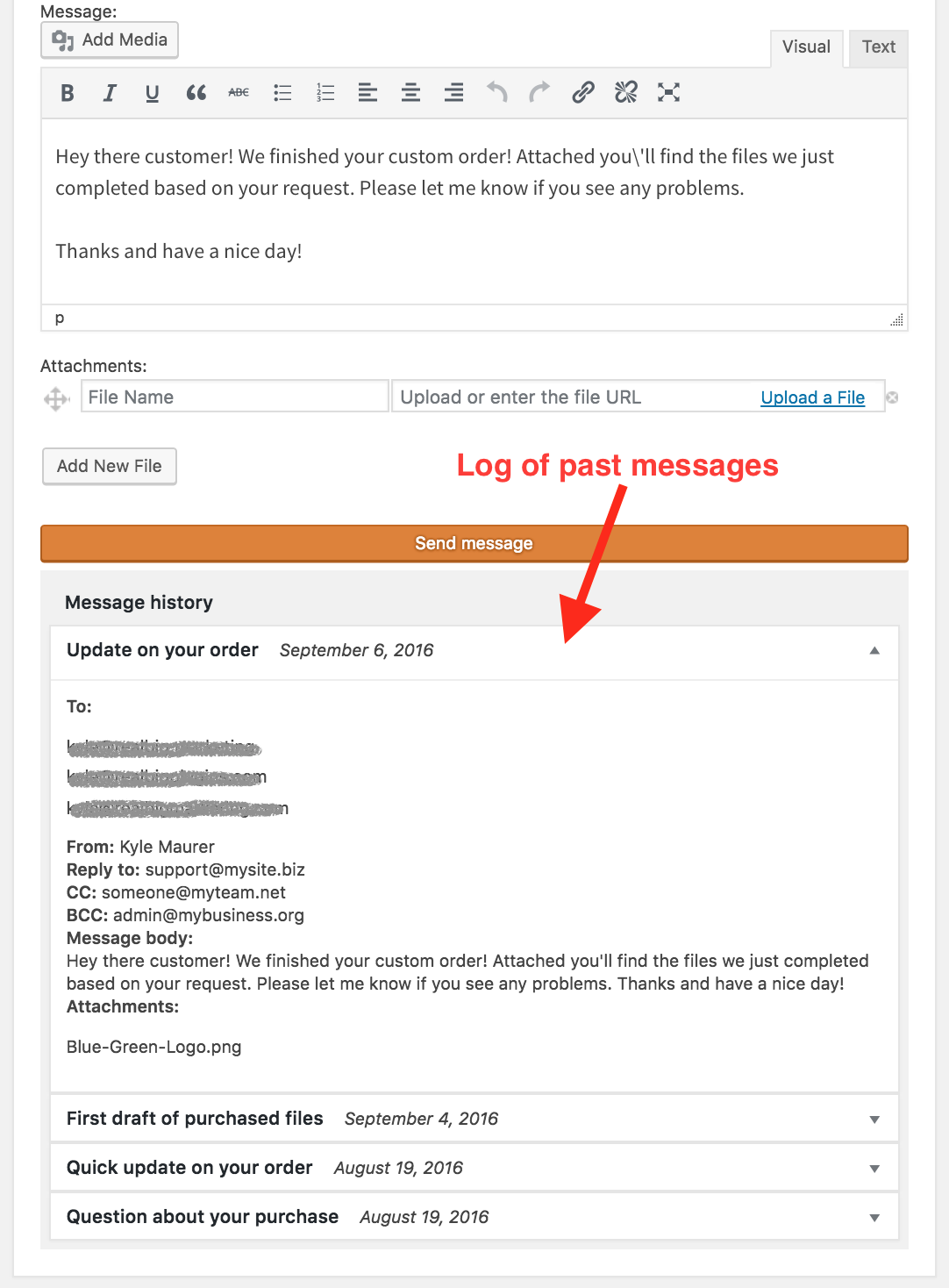Messages sent to customers and vendors from the dashboard can also include attachments so you can send customers files quickly and conveniently. EDD Message also integrates with our Amazon S3 extension so files can be selected from your S3 buckets and used as attachments.