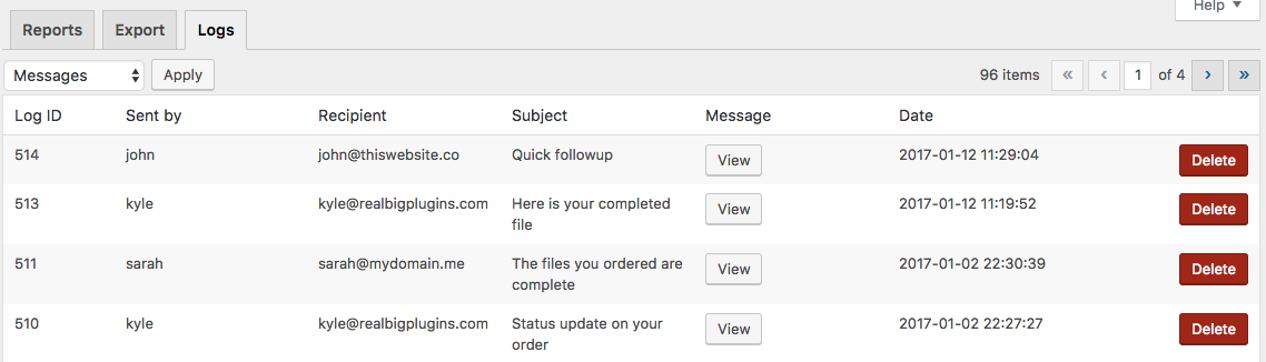 EDD Message keeps a record of all the messages that have been sent for you to reference in the future. Messages sent to a specific customer are visible on the Message view for that customer and a table of all logged messages is included in Reports – > Logs.