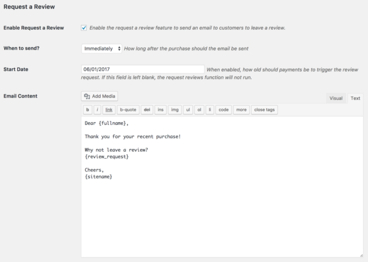To help encourage customers to leave reviews on products they purchased, automated emails can be configured that get sent to customers after a successful purchase. Emails can be sent immediately after purchase or after a delay of several days.