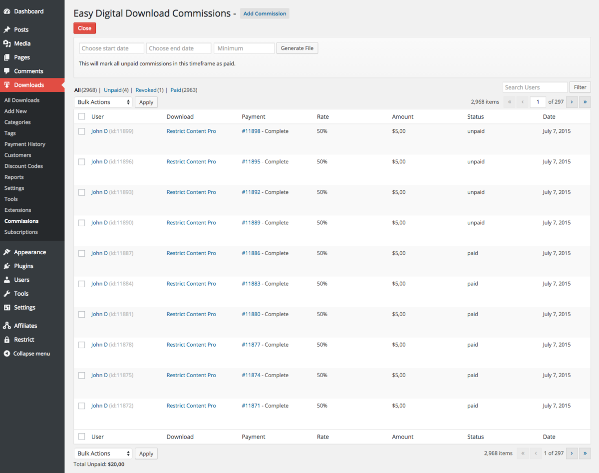 This extension includes the ability to generate a CSV file of all unpaid commissions, or unpaid commissions over a specific date range, that you can then upload to PayPal’s mass payment system, or use to process the commission payouts however you wish.
