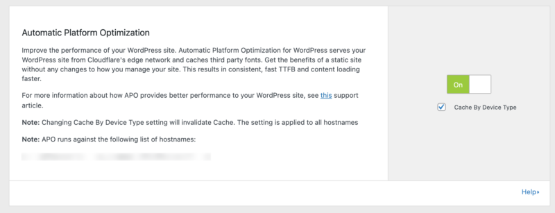 After you have connected your site to Cloudflare, you can turn on the Automatic Platform Optimization from the Settings > Cloudflare > Home settings within your WordPress admin area.