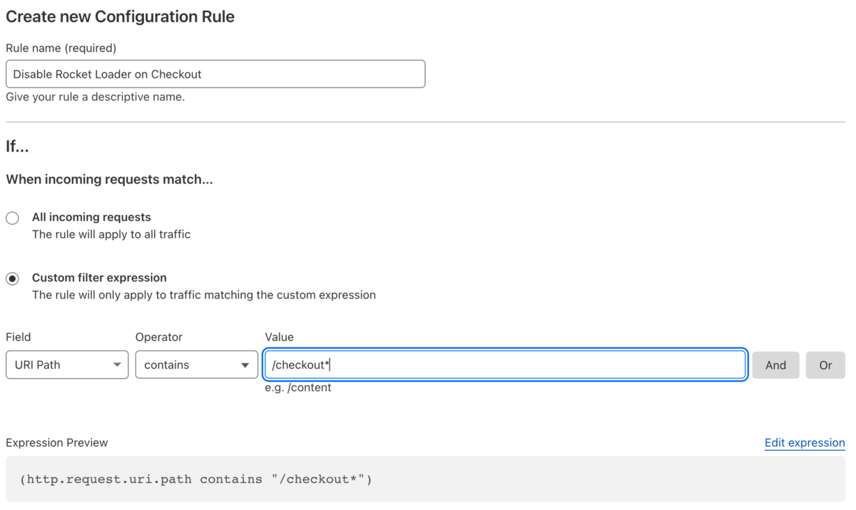 Then configure a rule that turns off ‘Rocket Loader’ on the checkout page. Our example uses the default checkout page of /checkout