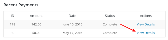 On the edit page you’ll find a Recent Payments box. Click View Details on each payment.