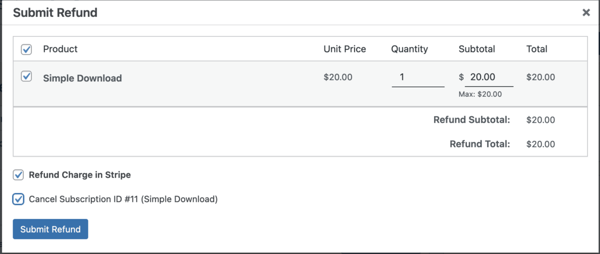 Once you click the Submit Refund button the items will be refunded, any subscriptions tied to the order will be canceled if the checkbox to cancel them was checked and a new record in the database will be stored for this refund.