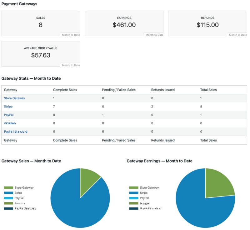 The Payment Gateways report shows what payment gateways are used during the set timeframe.