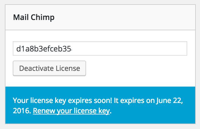 When you purchase a plugin it comes with a license or a specific amount of time. When the license expires your product will continue to work, but you will lose benefits like support, updates, etc. To help prevent any amount of time outside support and updates, the EDD license page will show an alert in a blue bar that says Your license key expires soon! It expires on [date]. There will also be a link to renew your license key. Example: