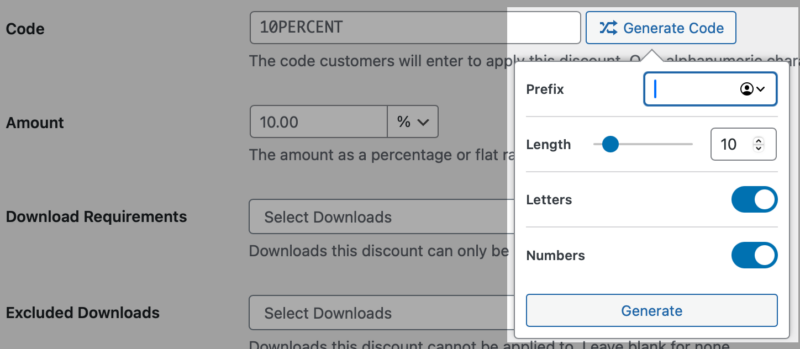 Easy Digital Downloads (Pro) users can generate unique discount codes. This tool allows you to specify a Prefix, Length, and if it should contain letters and/or numbers.
