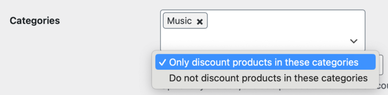 Select the Product Categories you want the discount to apply (or not apply) to. After a category is selected, a dropdown box appears to determine if the selected categories are discounted or excluded from the discount.
