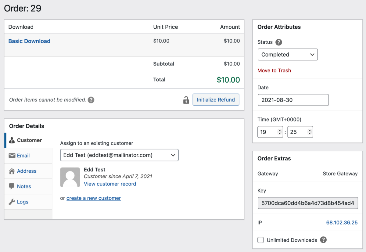 Easy Digital Downloads holds a detailed record of all purchases made on your site. Each purchase, even if failed or incomplete, creates a new order which you can view inside your dashboard. Orders can also be manually created by store administrators.
