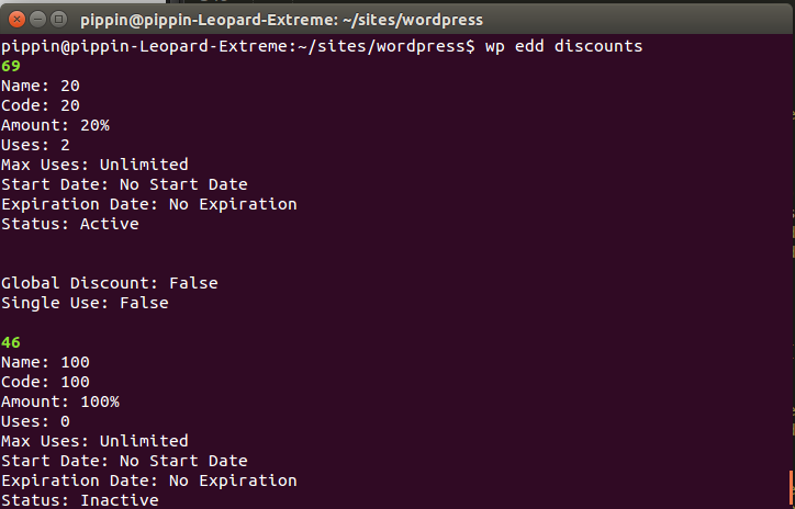 The wp edd discounts command provides a list of discount codes available in your store. It accepts an optional –id=# parameter to allow you to view the details of a specific discount code: