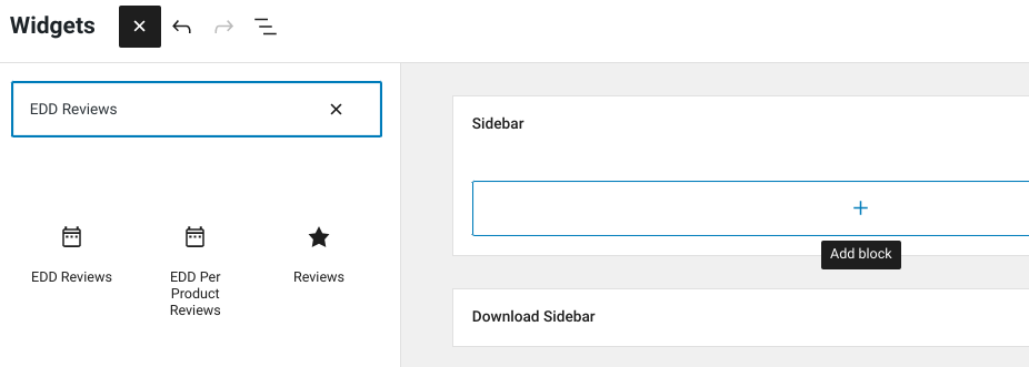 This Easy Digital Downloads extension comes with shortcodes and multiple widgets (Appearance » Widgets) for showcasing reviews across the frontend of your WordPress site. You can insert them anywhere where blocks/widgets are supported, like pages, sidebars, and footers: