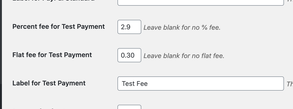 At the bottom of the page is an area to set up a label and either a flat fee or a percentage fee for each Gateway you have enabled. The screenshot below shows how you can add a 2.9% + $0.30 cents fee for purchases made with the Test Payment for example.