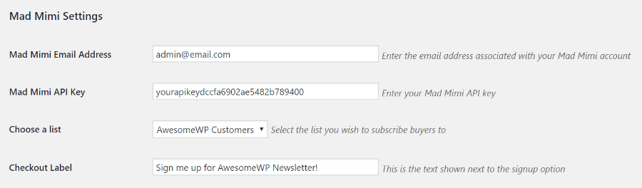 It’s quick and easy to get the Mad Mimi add-on up and running. Enter your Mad Mimi email address and API key, choose the email list to subscribe users to, and define the checkout field label – all within the Misc section of the Easy Digital Downloads Settings (Downloads → Settings → Misc) :