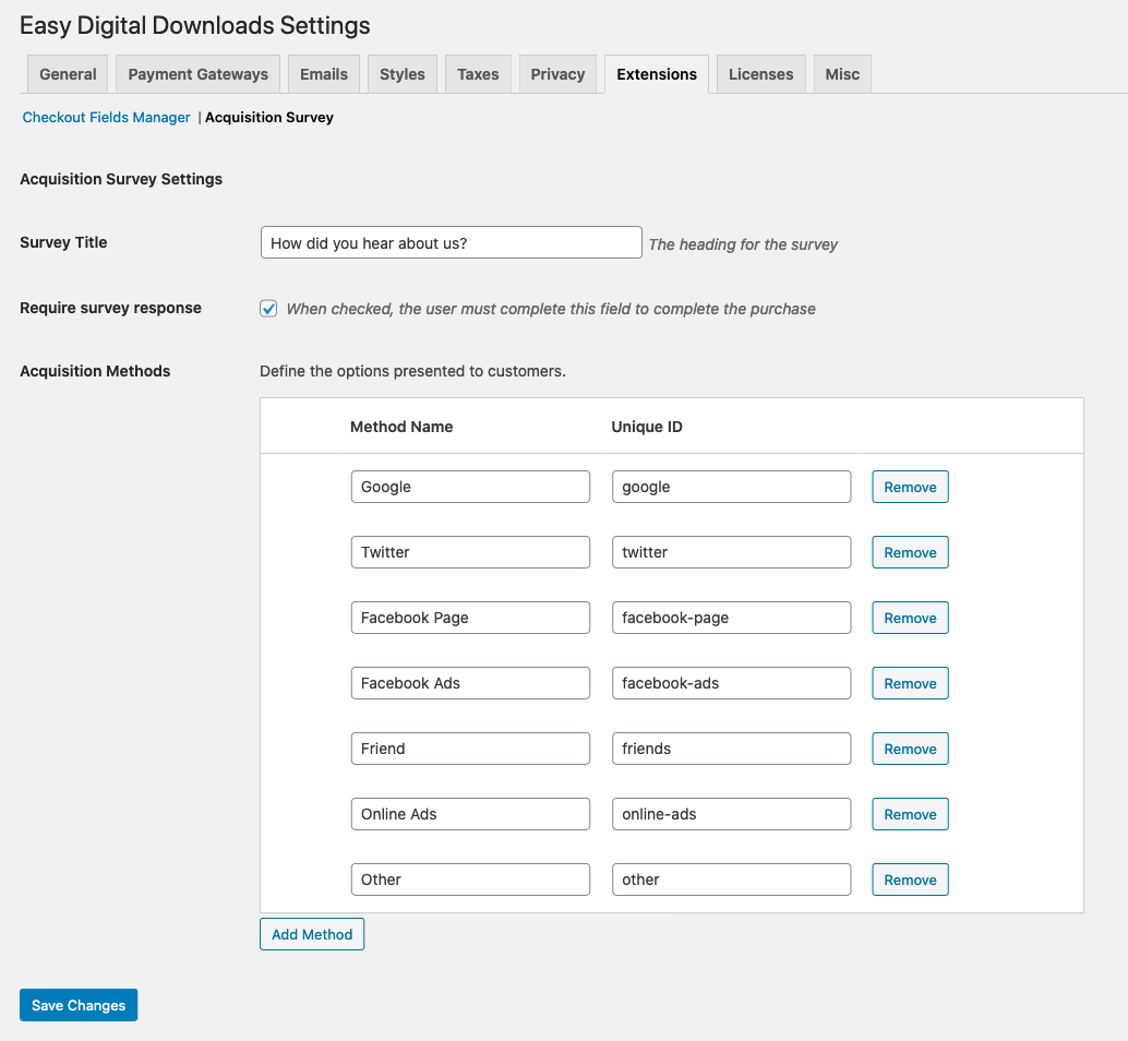 Once the Acquisition Survey extension is installed and activated, you can navigate to Downloads → Settings → Extensions → Acquisition Survey to adjust your settings.