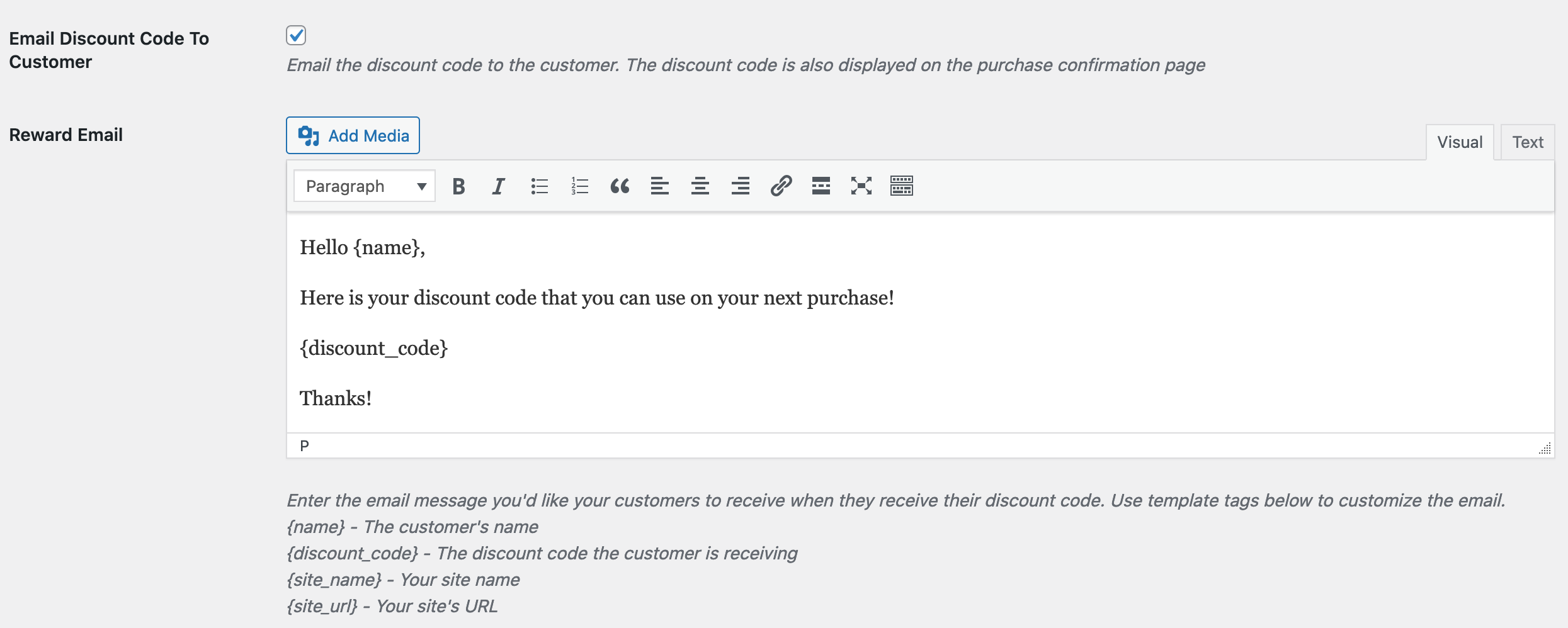 Reward Message: Message shown when purchase meets reward requirements. Default: We’d like to offer you a {discount_amount} discount which you can use on your next purchase: