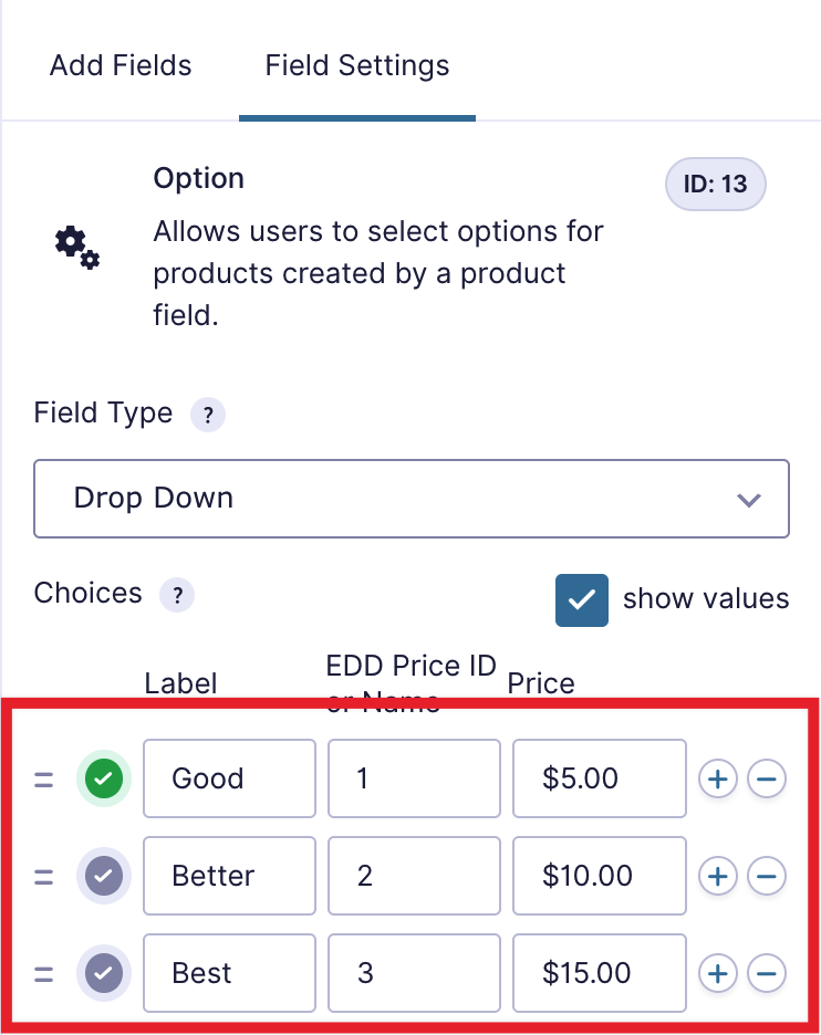 You can see in the next screenshot that the values that have been set are 1, 2, and 3. even though the names are different, it will be connected because those numbers match the EDD variation positions.