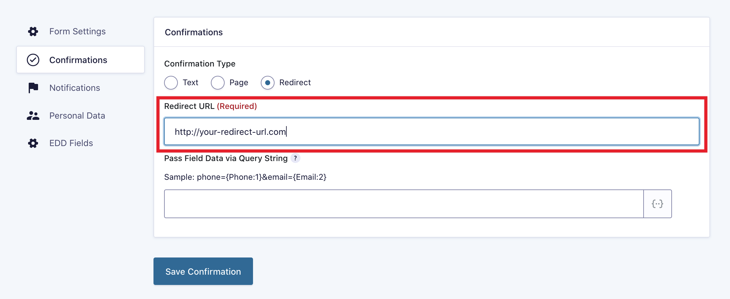 Change the “Confirmation Type” to “Redirect”. Once it’s set to redirect, update the Redirect URL setting to the Purchase Confirmation page URL from Easy Digital Downloads.