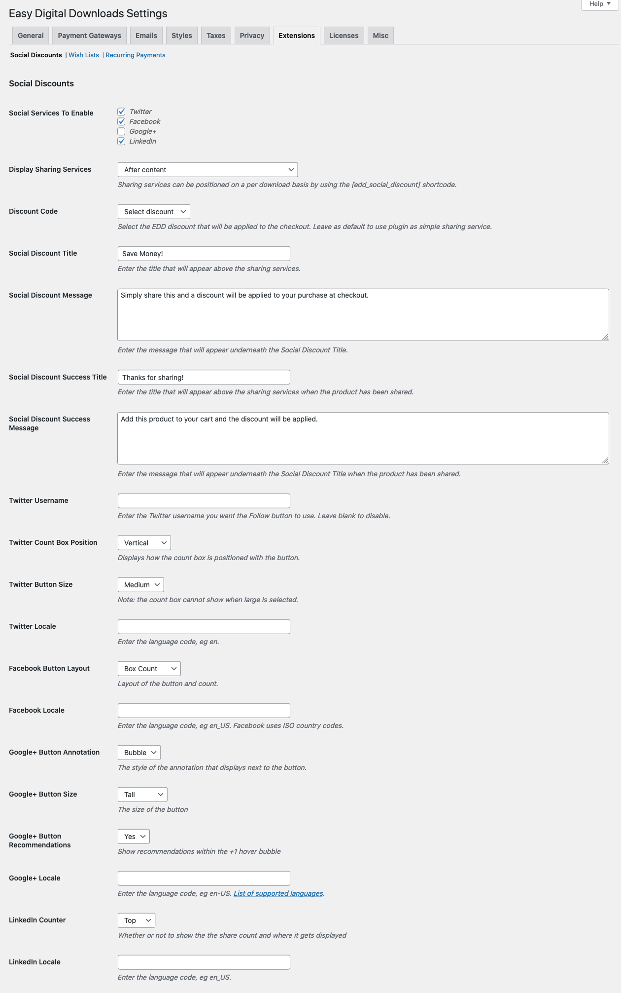 After you have installed and activated the Social Discounts extension, navigate to Downloads → Settings → Extensions → Social Discounts. You’ll first want to select the social networks you’d like people to share to, and then select your discount code. By not selecting a discount code, you can use it as a simple sharing tool.