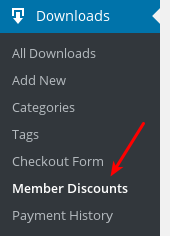 Immediately after installing the Member Discount extension you will find a Downloads → Member Discounts menu option in the WordPress admin.