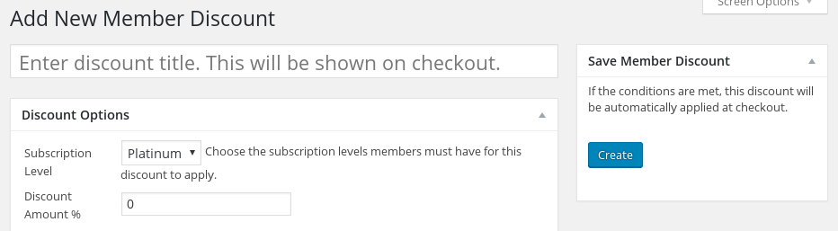 The options for creating a new discount are quite simple. You provide a Title, which will be displayed on the checkout form, choose a Subscription level, and then a percentage off the total cost.