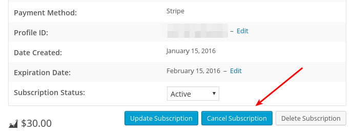 When using Stripe, a cancellation may be initiated either from within EDD or from the Stripe Dashboard.