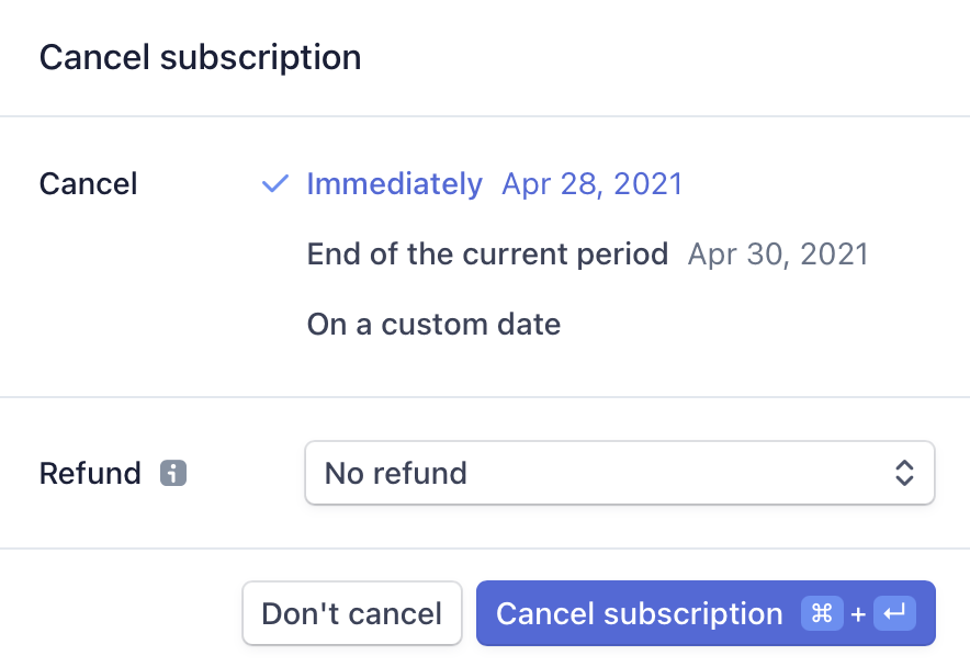 If you click Cancel (X icon to the of the subscription name) you’ll be given three options; to cancel Immediately, at the end of the current period, or on a custom date. For the purposes of EDD it doesn’t matter which you choose immediately or at the end of the current period, your customer won’t experience any difference between the two. If you choose a custom date, that’s after the end of the current period, they will continue to get billed until the custom date passes.
