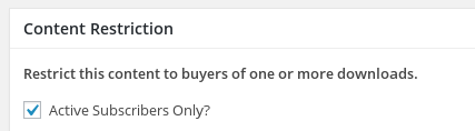 When activated, Content Restriction creates a meta box on every post type except Downloads (e. g. Pages, Posts, and any custom post types). With Recurring Payments integration it also includes a checkbox to require an active subscription.