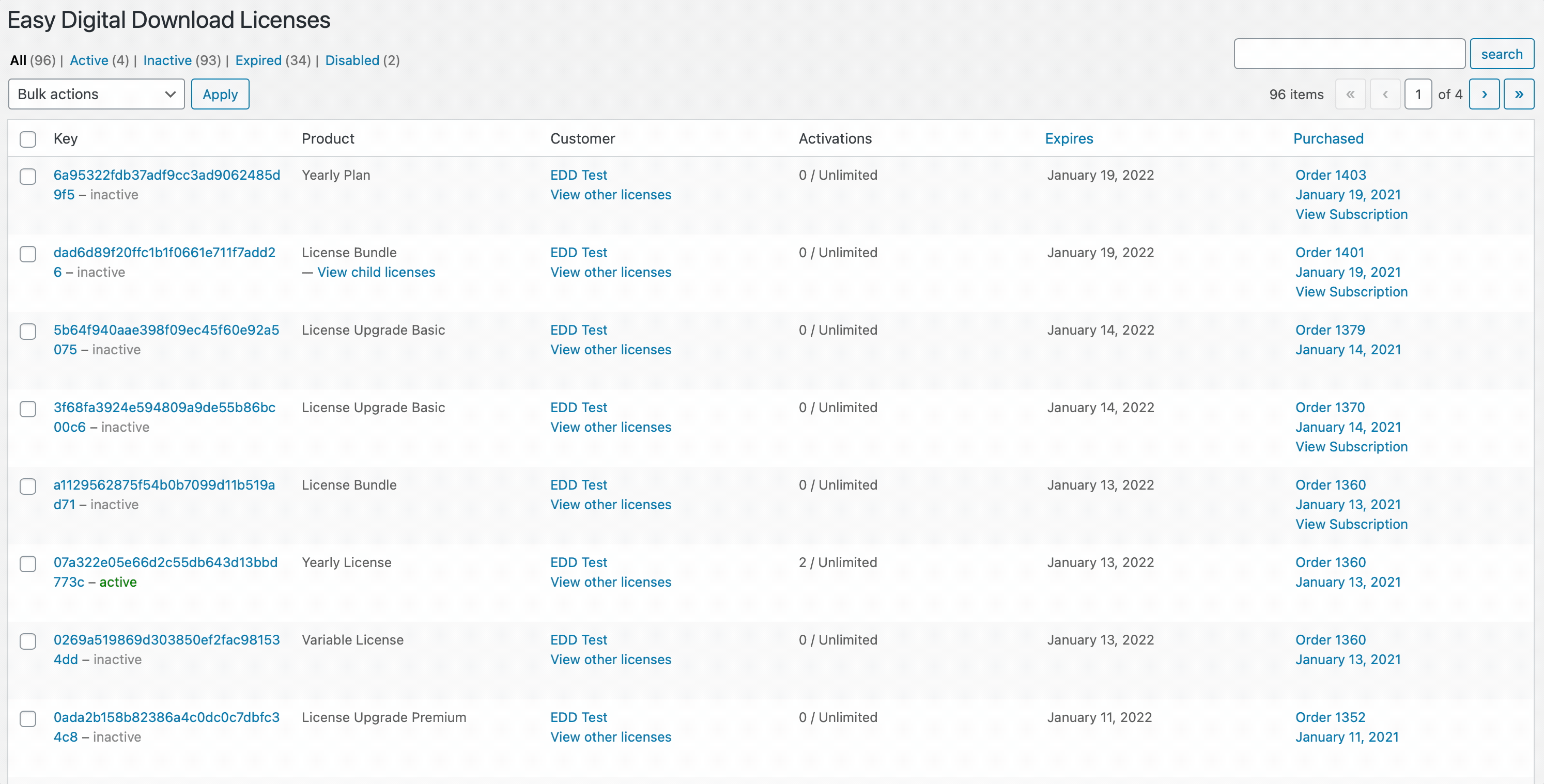 - Disabled: A key will be set as Disabled when a purchase is Revoked or Refunded, or may be set so manually.