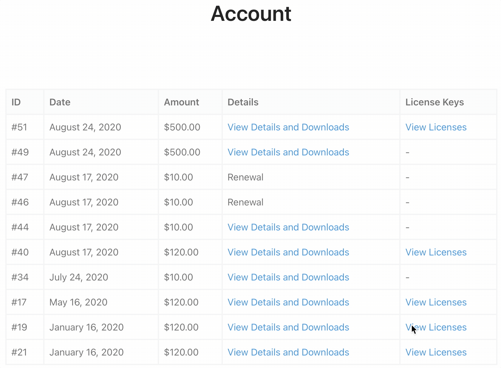 Customers’ license keys can be shown in their account page using the [edd_license_keys] shortcode. This will display all license keys that belong to a customer (requires that they are logged in) along with relevant information about the license, such as expiration date, status, renewal options, upgrade options, and a link to view the purchase record for the license.