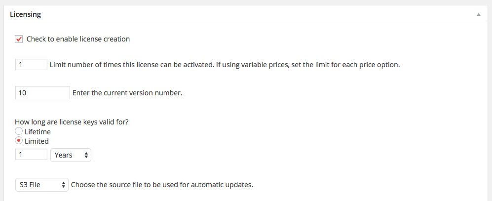 Checking this box will cause license keys to be generated anytime someone purchases this product. When a license key is generated, you will be able to see it on the Downloads → Licenses page.