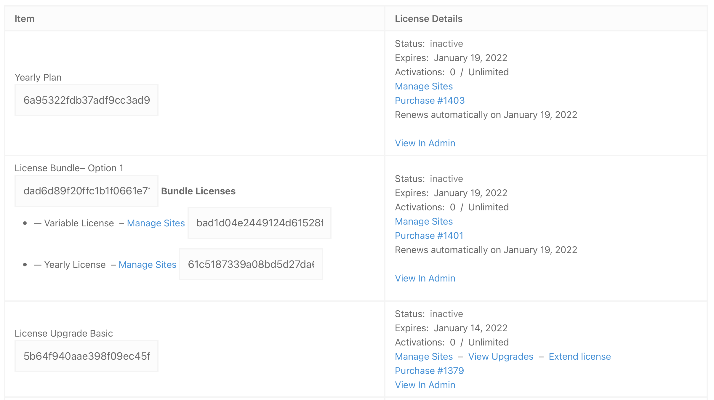 The Downloads → Licenses page provides an overview of all the license keys you have sold. Clicking the key will open the License Details. Several pieces of information are listed with each key: