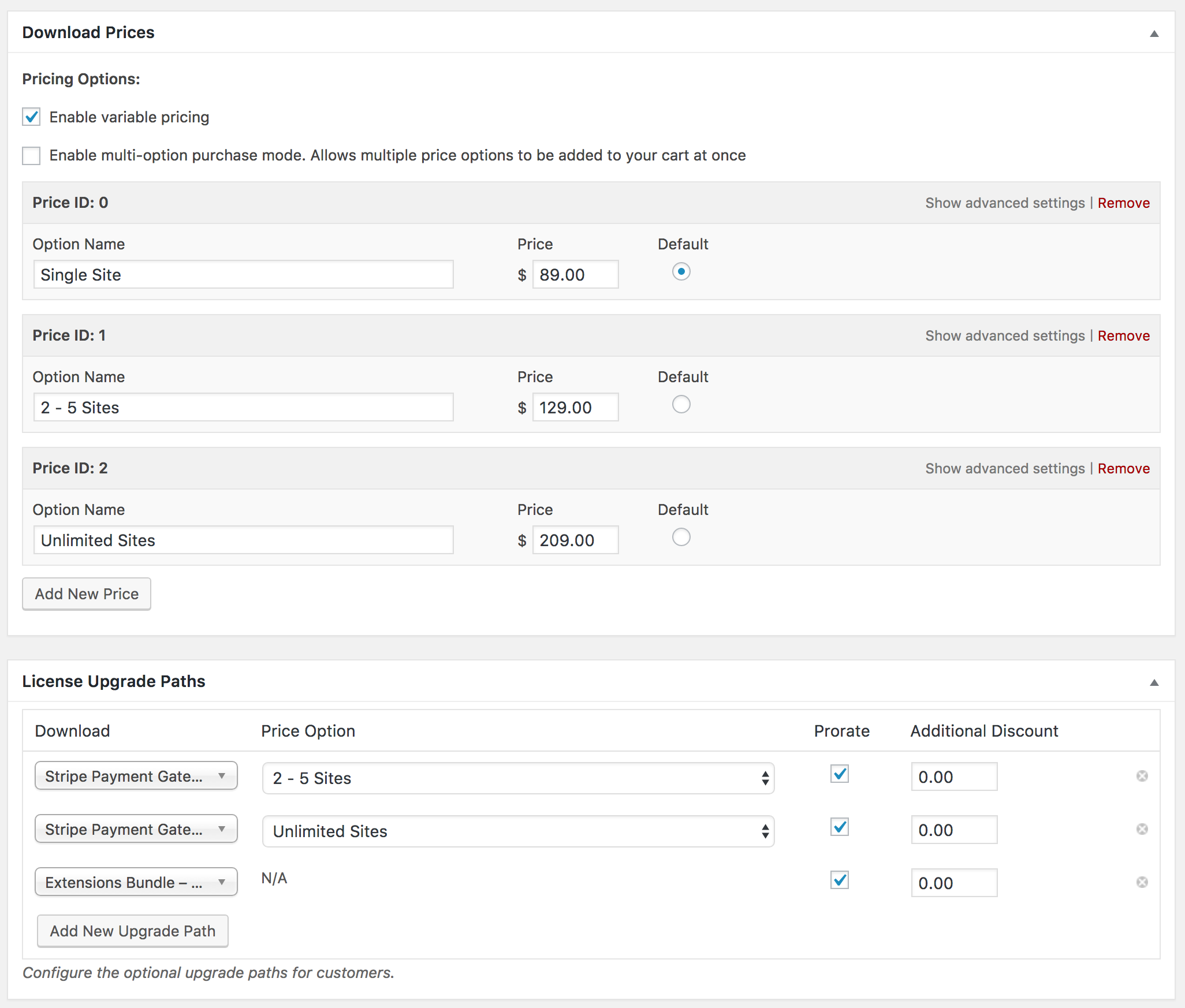 To create an upgrade path, first select the Download product that customers can upgrade to. This can be the same product or another product in your store’s catalog that has licensing enabled. If the Download you have chosen has variable prices enabled, a Price Option drop down field will appear that lets you select the price option the upgrade is for.