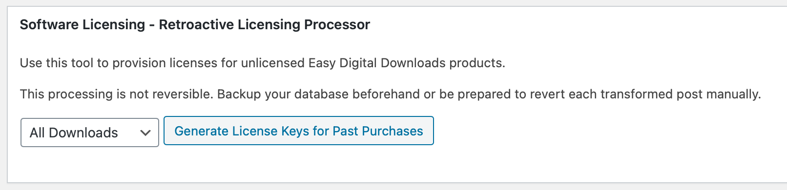 If you have been selling for some time before activating Software Licensing and you wish to go back and generate license keys for those orders, you can do that by going to Downloads → Tools and using the Retroactive Licensing Processor.