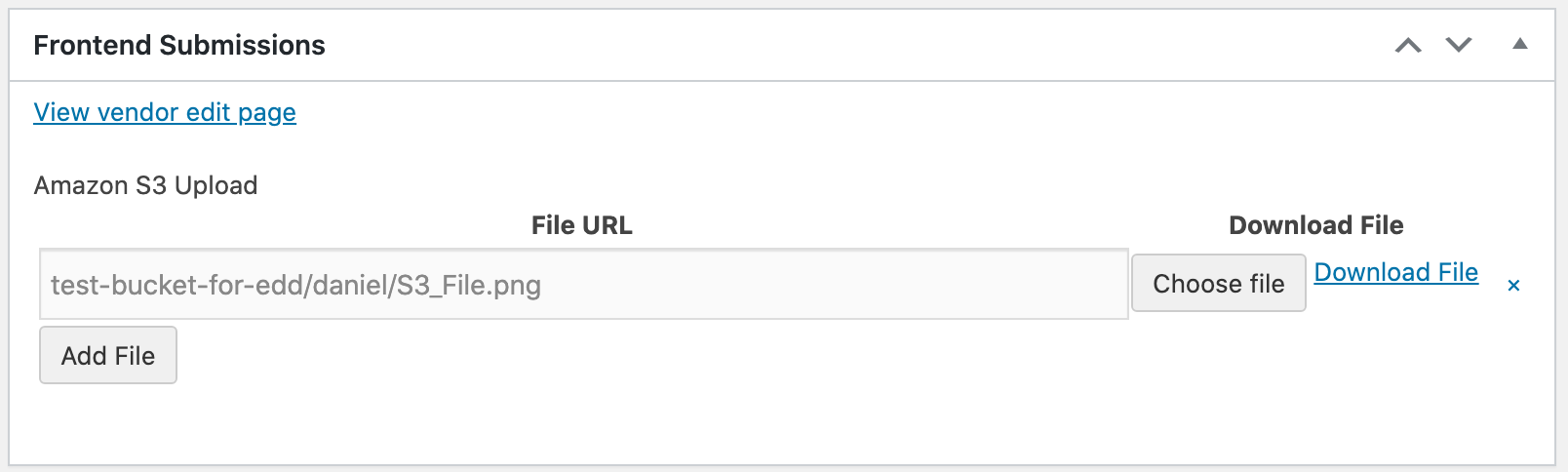 When Amazon S3 and Frontend Submissions are both installed, files that are uploaded by Vendors (via the “Download Prices and Files” field on the “Add/Edit Product” page in their Vendor Dashboard) will be automatically transferred to your S3 account. There are no additional settings to configure; it’s all automatic.